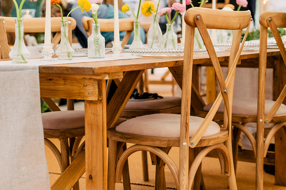 • The maximum capacities stated on our packages, are based on using our folding wooden chairs. The capacities can increase up to 132 seated guests for Kiplin Hall and 144 seated guests for Almscliffe Valley, if you switch to either Cross Back Chairs or Chiavari Chairs. This is based on 12 guests per table. An additional supplement will apply if any changes are made to the furnishings included within each package.