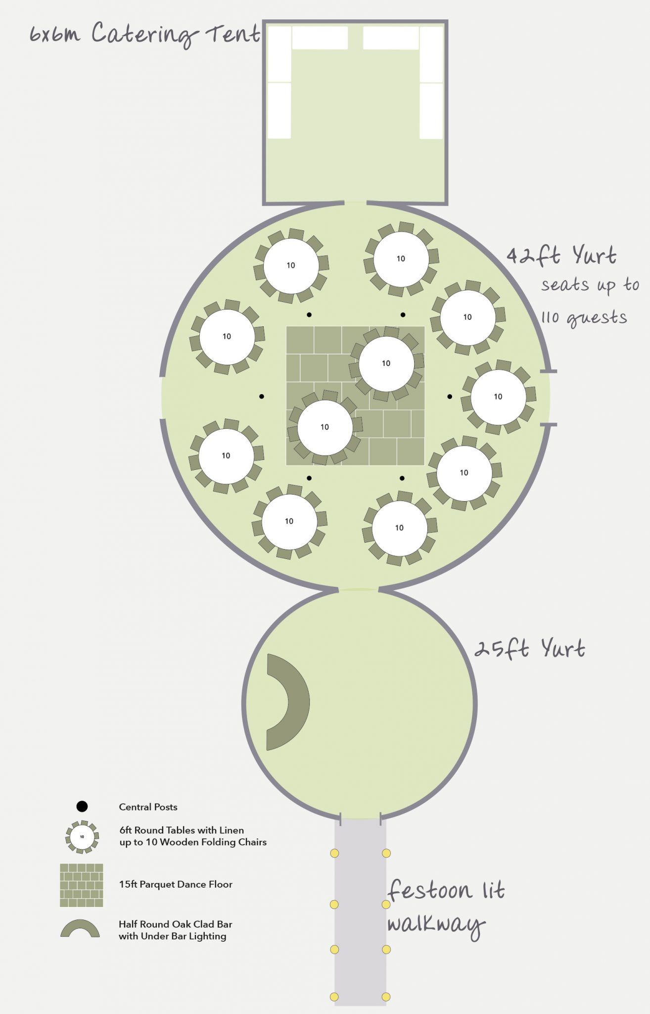 Our 42ft and 25ft Yurts will be yours for the day. Walk up a festoon lit walkway, to enter into the yurts for an arrival drink. Be sure to check out our drink’s packages, so you and your guests will have a drink ready and prepared for your arrival. After stepping through the beautiful set of solid oak doors, you will find the main reception yurt; furnished with round tables, white table linen and folding wooden chairs. Choose from a wealth of catering options, provided by the spectacular Friends4Dinner.